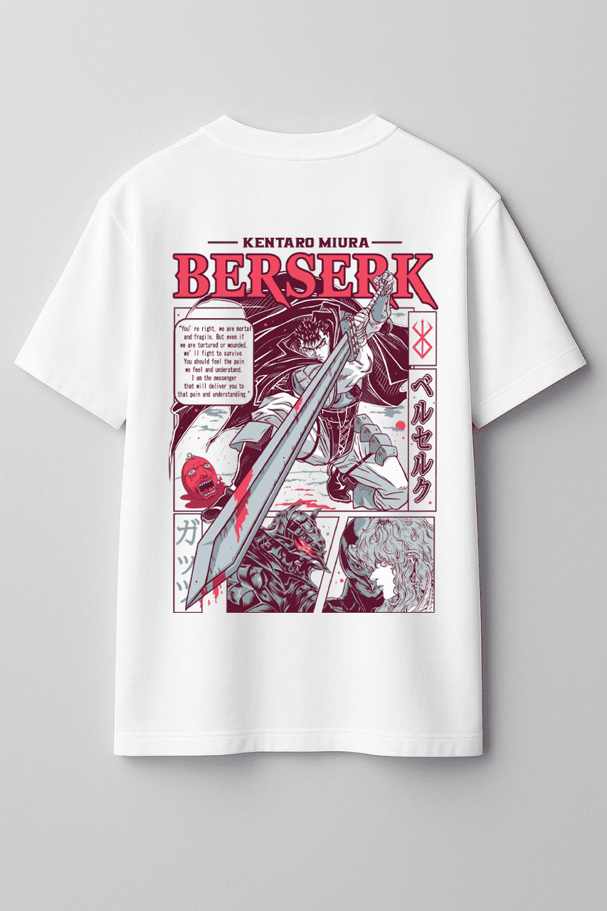 طرح معروف گاتس با شمشیر عظیمش روی تیشرتی با کیفیت چاپ عالی، که هم توی رنگ سفید و هم مشکی موجوده. یه انتخاب خفن برای اونایی که دنبال یه استایل خاص و خفن میگردن.